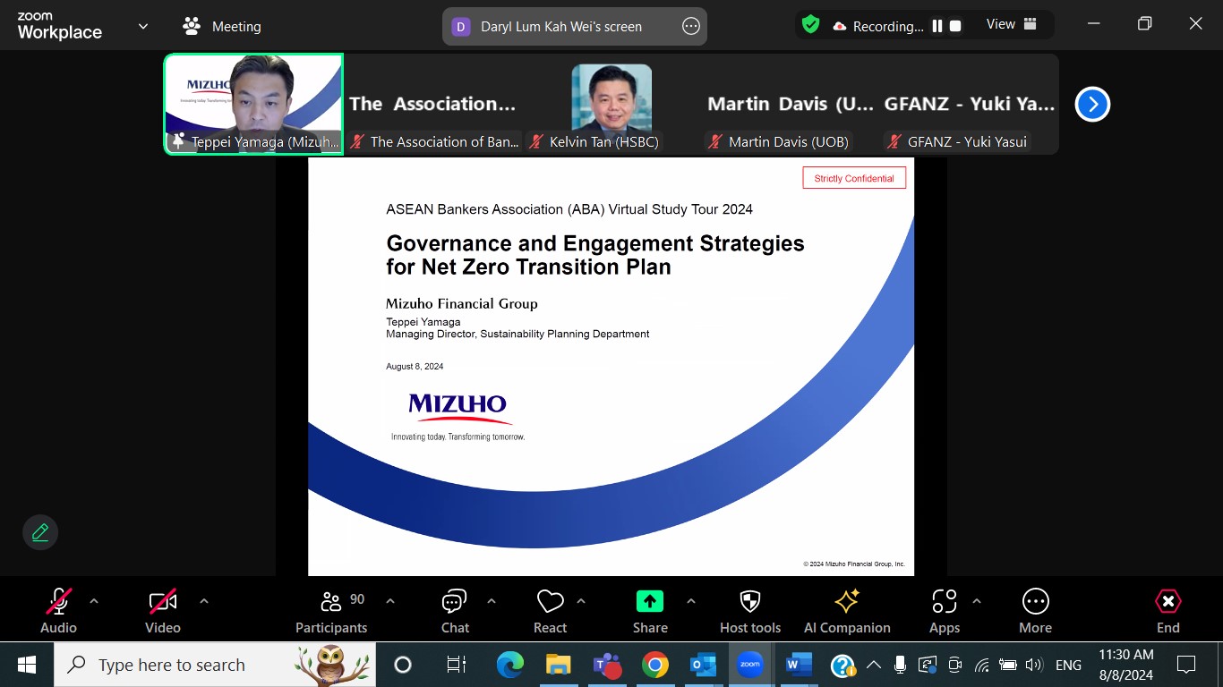 The Association of Banks in Malaysia as the Chair of the ASEAN Bankers Association (“ABA”) Permanent Committee on Inter-Regional Relations (“IRR”), organised the ABA Virtual Study Tour 2024 where a sharing session/panel discussion on the journey and experience towards achieving net zero by GFANZ (“Glasgow Financial Alliance for Net Zero”) and its partner organizations, UOB Singapore, HSBC Singapore and Mizuho Financial Group was held on 8 August 2024. The speakers and moderator during the session were: